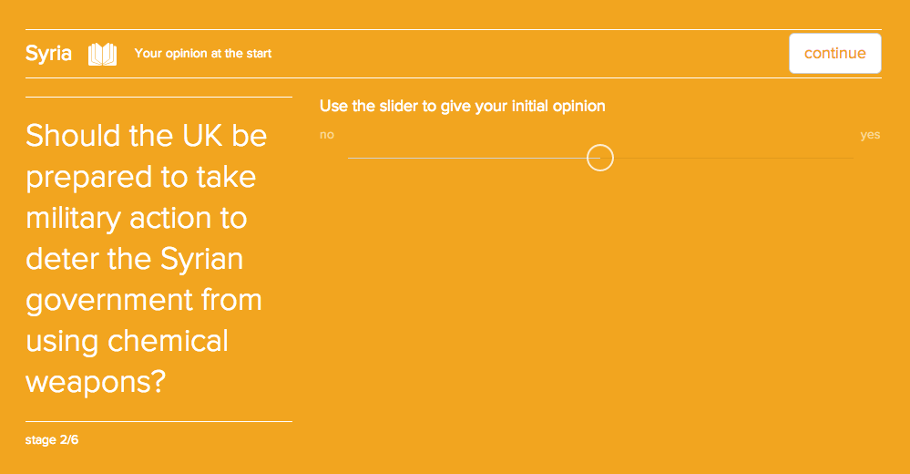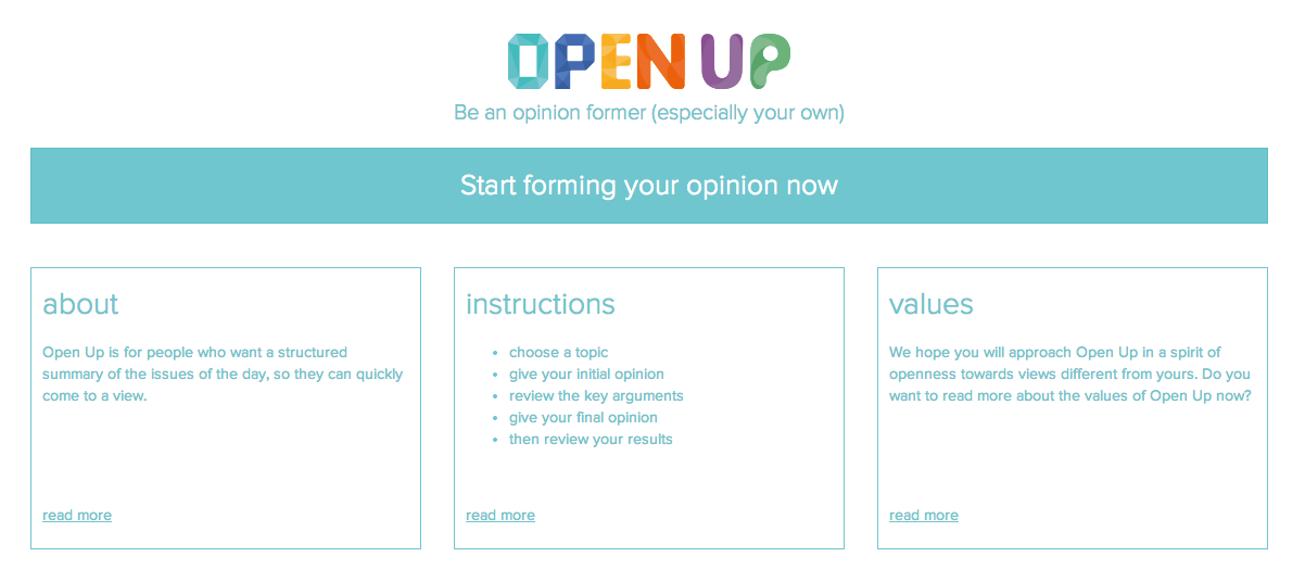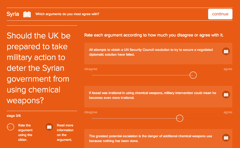This is the heart of Open Up. You are presented with a dozen arguments. First you are asked which arguments you most agree with.