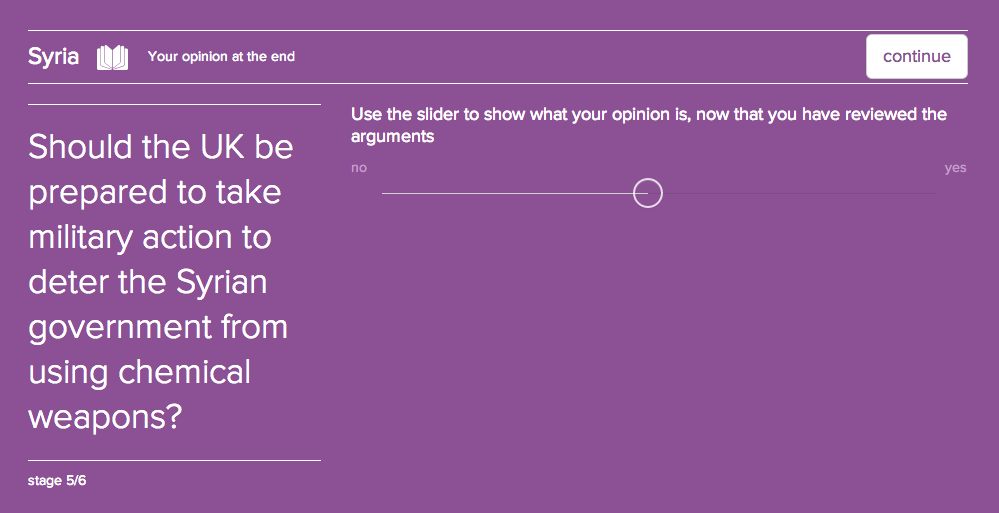 This screen asks you to give your opinion before you review the arguments on this issue. That will allow you to see if the arguments have altered your opinion.
