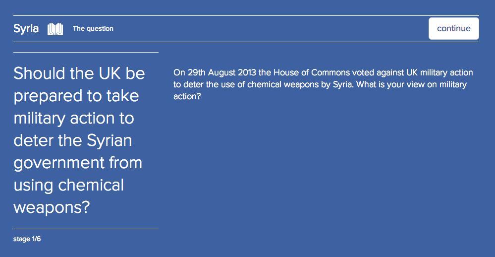 Now you are introduced to the question you are invited to answer, in relation to that topic. Clicking on the book symbol next to the name of the topic will provide you with background on the topic.