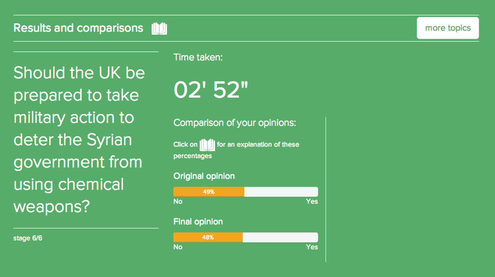 Here are your results. Your final and your initial opinion are together, so you can see if your view changed, together with a reminder of your top arguments. In time, you will be able to compare your results with experts and specialists in the topic.